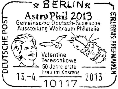 | 590 | Astro Philatelie 2013, Gemeinsame Deutsch-Russische Ausstellung Weltraum Philatelie in Berlin (Valentina Tereschkowa 50 Jahre erste Frau im Kosmos, Porträt Tereschkowas, Sojus-Raumschiff und Friedenstaube) | 10117 | Berlin | 13.04.2013 | D |