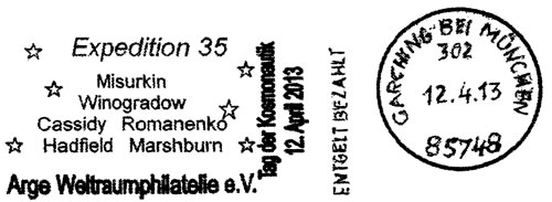 | 591 | Expedition 35 – Misurkin,Winogradow, Cassidy, Romanenko, Hadfield, Marshburn und sechs Sterne (Tag der Kosmonautik) | 85748 | Garching bei München | 12.04.2013 | D |