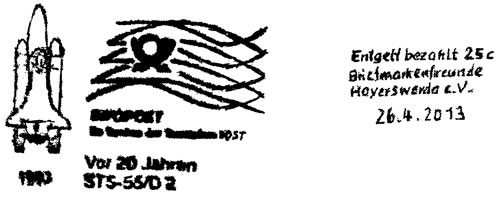 | 592 | Vor 20 Jahren Space Shuttle STS-55/D2-1993 (Space Shuttle und Posthorn) | | Infopost Hoyerswerda | 26.04.2013 | D |